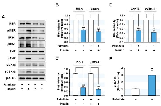 Palmitate impaired insulin signaling and elevated miR-183-5p expression in HepG2 cells. HepG2 cells were pretreated with BSA (control) or palmitate (0.5 mM) for 18 h and incubated with or without 100 nM insulin for the last 30 min. (A) Representative immunoblots of insulin signaling molecules (INSR, IRS-1, Akt2, and GSK3β) and their phosphorylations (pINSR, pIRS-1, pAkt2, and pGSK3β) are shown. (B–D) The respective densitometry measurements, normalized versus β-Actin. (E) The miR-183-5p levels were determined using qRT-PCR. The results in immunoblots and qRT-PCR are presented as a relative ratio, normalized to BSA controls set to one. Results are presented as means ± SEMs (n > 3). **, p < 0.01; ***, p < 0.001 vs. BSA controls.