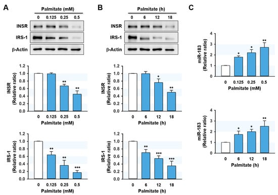 Palmitate regulated IRS-1 and miR-183-5p expressions in a dose- and time-dependent manner. HepG2 cells were preincubated with BSA or palmitate at 0.125–0.5 mM concentrations for 6 to 18 h. The expression levels of INSR and IRS-1 protein (A,B) or miR-183-5p (C) in various doses of palmitate and incubation time are shown. The protein expressions of INSR and IRS-1 were normalized versus β-Actin. The results in immunoblots and qRT-PCR are expressed as a relative ratio, normalized to control to one. Results are presented as means ± SEMs (n > 3). *, p < 0.05; **, p < 0.01; ***, p < 0.001 vs. BSA controls.