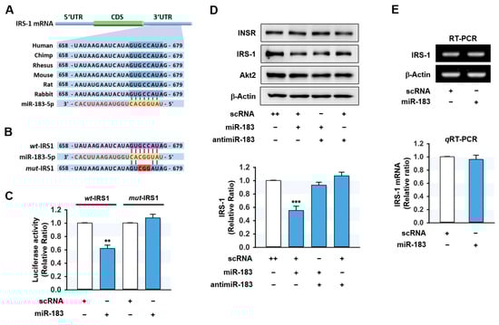 MiR-183-5p directly targeted the 3’UTR of IRS-1 and suppressed IRS-1 protein expression. (A) Graphic illustration of the conserved binding site for miR-183-5p within the 3′UTR of IRS-1. (B) The sequence of miR-183-5p binding site with wild-type (wt-IRS1) or mutant (mut-IRS1) 3′UTR of IRS-1. (C) The relative luciferase activity was performed after 24 h of reversed transfection with either the miR-183-5p or scRNA control (200 nM). (D) Representative immunoblots of INSR, IRS-1, and Akt2 after transfection with scRNA, miR-183-5p mimic, or antimiR-183 for 24 h. (E) Transcriptions of IRS-1 were determined by RT-PCR (upper) and qRT-PCR (lower). The results in immunoblots and qRT-PCR are expressed as a relative ratio, normalized to control set to one. Results are presented as means ± SEMs (n > 3). **, p < 0.01; ***, p < 0.001 vs. scRNA controls.