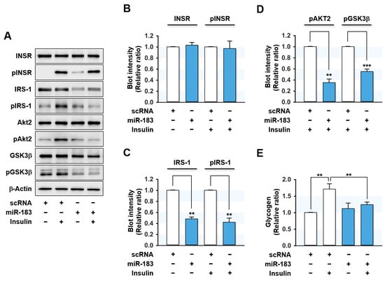 As miR-183-5p suppressed IRS-1 protein expression, we next investigated whether miR-183-5p induction provoked impaired insulin signaling in HepG2 hepatocytes. Transfection with miR-183-5p mimic drastically reduced IRS-1 expression and concomitantly inhibited insulin-stimulated IRS-1 phosphorylation without altering the expression or phosphorylation of INSR (Figure 5A,B). Furthermore, insulin-stimulated phosphorylations of downstream signaling proteins of IRS-1, such as Akt2 and GSK3β, were also significantly impeded by miR-183-5p mimic transfection (Figure 5A–D). This impaired proximal insulin signaling cascade was shown to be mainly ascribed to IRS-1 reduction. Next, we analyzed the effect of miR-183-5p on glycogen synthesis in HepG2 cells (Figure 5E). Insulin increased glycogen synthesis in scRNA control cells, whereas transfection with miR-183-5p mimic significantly decreased insulin-stimulated glycogen synthesis. Collectively, these data suggested that miR-183-5p hinders insulin signaling and insulin-stimulated glycogen synthesis by suppressing IRS-1 protein expression.