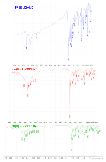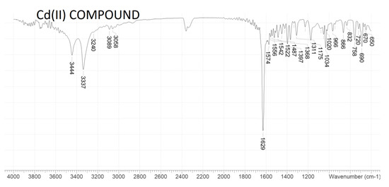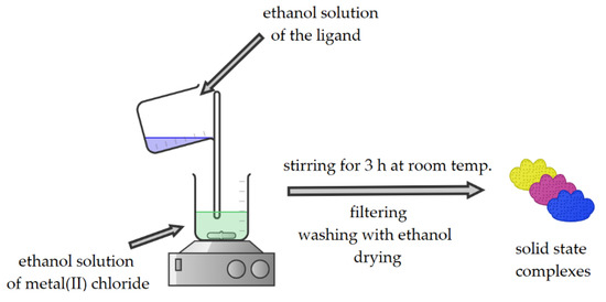 In all cases, molar ratio of the ligand and copper(II), zinc(II), or cadmium(II) chloride was 1:1. Ethanol solution of the ligand was slowly added to ethanol solutions of copper(II) and zinc(II) chloride, and to water/ethanol (v/v = 1/1) solution of cadmium(II) chloride. Total volumes did not exceed 60 mL. Reaction mixtures were stirred on a magnetic stirrer for 3 h. After that time, precipitates of complexes were filtered, washed several times with ethanol, and later dried in the open air, weighted, and analyzed (Figure 1).