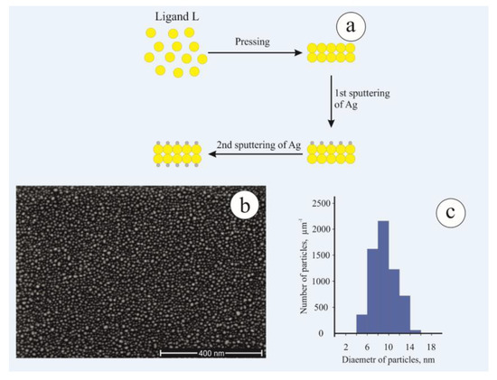 Pellets were made from Cu(L)Cl2, Zn(L)Cl2, Cd(L)Cl2 using a laboratory press AE&T T61220M. The thickness and diameter of the tablets were about 500 μm and 5 mm, respectively. The pressure applied to compress the polymer samples was in the order of 3 tons, which was applied for 5 min. At the final stage, the formation of silver nanoparticles was carried out using the method of vacuum-thermal evaporation at a residual pressure of 3 × 10−5 Pa. The weight of the evaporated sample of silver was about 2 mg. The distance between the substrate and the evaporated sample was about 20 cm. The evaporation was carried out on two sides of the polymer pellet (Figure 2a). The average size of silver nanoparticles was about 15–20 nm; the average height was 2–3 nm (Figure 2b,c).