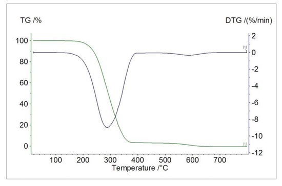 Ligand itself is thermally stable up to 140 °C. Its decomposition is presented in Figure 5. From 140 °C up to 380 °C, we observe main mass loss (mass loss found, 96%). From this temperature up to 700 °C, we can observe a small mass loss (mass loss found, 4%), which can most likely be ascribed to postcombustion processes of the organic molecule.