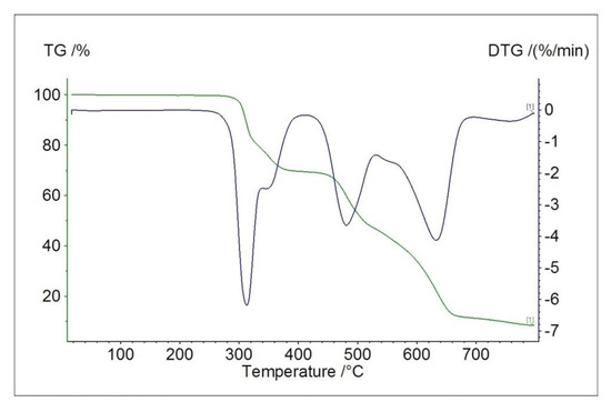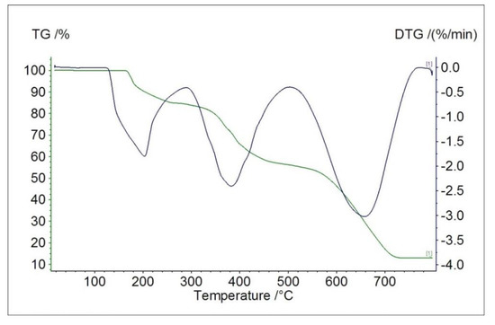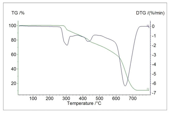 TG (green) and DTG (blue) curves showing ligand decomposition pattern in air.