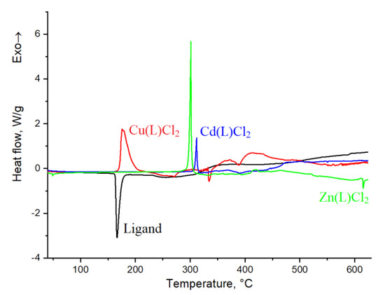 For ligand, an endothermic melting peak is seen in the temperature range from 162 to 180 °C; this is coincident with the literature [39]. For Cu(L)Cl2, the appearance of additional peaks can be seen: exothermal effect from 166 to 209 °C and two endothermal effects from 332 to 343 °C and from 377 to 404 °C. For Cd(L)Cl2, there is an additional exothermal effect at the temperature range from 305 to 318 °C. Further, for the material with Zn(L)Cl2, two obvious effects can be seen: exothermal effect from 293 to 307 °C and endothermal effect from 614 to 619 °C. In addition to these thermal effects, the DSC curves also exhibit very wide exothermal effects at temperatures from 250 °C, which can be associated with decomposition processes. The appearance of additional effects on the DSC curves of doped materials can be related with the formation of new bonds and the decomposition processes. The obtained results can allow us to evaluate the effect of alloying on the properties of the material since the appearance of additional effects on the DSC curves of doped materials can be related with the formation of new bonds and the decomposition processes.