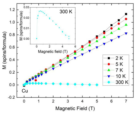 Magnetization of Cu(L)Cl2 as the function of magnetic field at 2.0, 5.0, 7.0, 10.0, and 300.0 K. The data show raw measurements after the extraction of an off-center linear diamagnetic background T−1, associated with the sample holder. The inset shows a magnification of the data at 300 K.