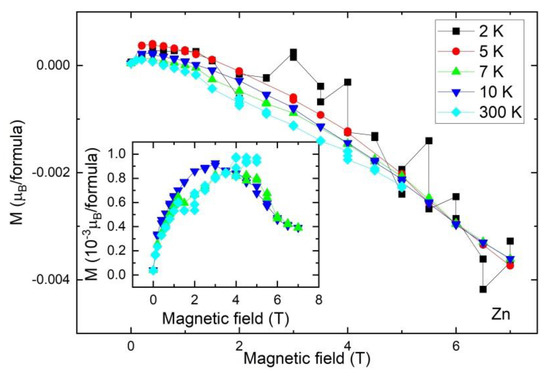 Magnetization of the Cd sample as the function of magnetic field at 2.0, 5.0, 7.0, 10.0, and 300.0 K. The data correspond to raw measurements after the extraction of an off-center linear diamagnetic background T−1, associated with the sample holder.