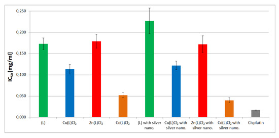 Both the ligand and its coordination compounds exhibit strong cytotoxic activity against A549 cancer cells. Of all investigated compounds, cadmium complex with silver nanoparticles showed the highest activity (IC50 = 0.040 ± 0.006 mg/mL) and can be considered a promising candidate for further exploration as an anticancer agent. This is a very good result, especially when compared with one of the most important cytotoxic compounds—cisplatin (IC50 = 0.017 ± 0.0001 mg/mL) [25].