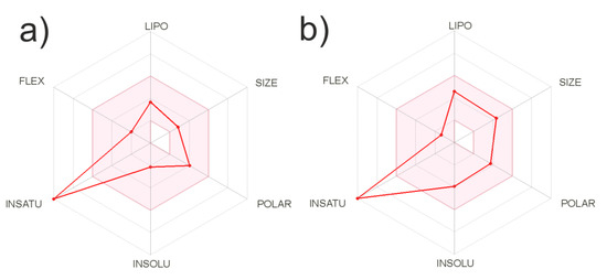 Bioavailability radar (lipophilicity (LIPO) are within the range −0.7 < XlogP3 < +5.0; molecular weight (SIZE) are 150 g/mol < MW < 500 g/mol; polarity (POLAR) are 20 Ų < TPSA < 130 Ų; insolubility (INSOLU) are 0 < logS < 6;—insaturation (INSATU) are 0.25 < Fraction Csp3 < 1; Flexibility (FLEX) are 0 < Num. rotatable bonds < 9) for ligand (a) and complex (b).