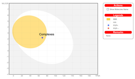 Performing an ADME analysis allows only those compounds that exhibit high biological activity and low toxicity to be selected for testing. Determination of drug-likeness, the chance of a compound becoming an oral drug, was performed by analyzing the physicochemical and structural properties. A bioavailability radar was generated for the ligand (Figure 16a) and one of the complexes (all complexes have similar plots—Figure 16b). All substances have satisfactory ADME properties, and the plots suggest high bioavailability; the only unfavorable property was a high unsaturation score in compounds. It is, however, important to notice that both ligand and all tested complexes meet the rules of Lipinski [50], Ghose [51], Egan [52], Veber [53], and Muegge [54]. Therefore, it can be concluded that all tested compounds are good drug candidates. Gastrointestinal absorption and brain access are important in selecting compounds for biological research and drug discovery. The BOILED-Egg diagram (Figure 17) shows that the complexes penetrate the blood–brain barrier and are absorbed gastrointestinally. The tested compounds were selected due to their physicochemical parameters, which indicate that they will be good candidates in the search for new active drugs.