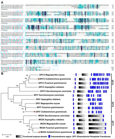Phylogenetic analysis of GPI ethanolamine phosphate transferase family proteins. (A) Multiple alignments of ethanolamine phosphate transferases CgGPI13, CgGPI7, and CgMCD4 in C. graminicola. Total sequence identity was 21.06%. (B) Phylogenetic tree of GPI ethanolamine phosphate transferases from different fungal species. EPT, ethanolamine phosphate transferase.