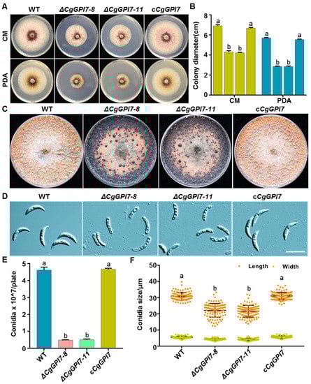 Biological phenotypic analysis of CgGPI7 knockout mutants. (A) Colony morphology of wild type, ΔCgGPI7-8, ΔCgGPI7-11, and cCgGPI7 grown on CM and PDA medium. (B) Statistical analysis of the colony diameters. Bar indicates the standard deviation of three replicates and the small letters indicate a significant difference (p < 0.01). (C) Sporulation of indicated strains on OA medium. (D) Conidia morphology of indicated strains. Scale bars = 25 μm. (E) Statistical analysis of the sporulation of indicated strains. Bar indicates the standard deviation of three replicates and the small letters indicate a significant difference (p < 0.01). (F) Statistical analysis of the conidia length and width of indicated strains. Bar indicates the standard deviation of 100 replicates and the small letters indicate a significant difference (p < 0.01).