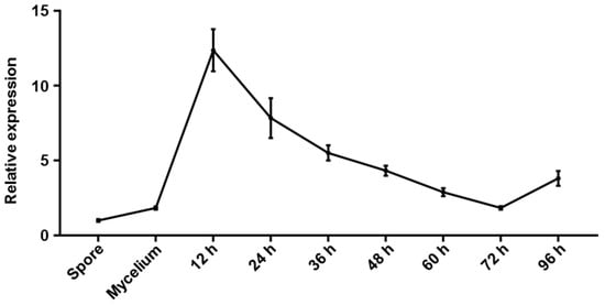 To further explore the function of CgGPI7, we performed the qRT-PCR method to detect the transcriptional levels of CgGPI7 at different development stages, including conidia and hyphae of C. graminicola in vegetative development stages. A conidial suspension of C. graminicola was sprayed on the maize seedlings and the inoculated leaf tissues were collected at 12 h, 24 h, 36 h, 48 h, 60 h, 72 h, and 96 h post-inoculation in the invasive growth stage. As shown in Figure 3, the expression level of the CgGPI7 gene was significantly up-regulated at the initial infection stage (12 hpi) and kept a relatively high expression level at the subsequent infection stages compared with the conidia stage. These results indicated that CgGPI7 might play a role in the pathogenicity of C. graminicola.