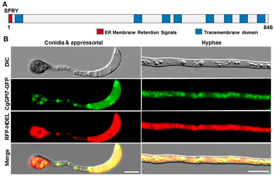 GPI anchoring usually happened in the endoplasmic reticulum (ER) and the GPI anchor synthesis pathway-related proteins were predominately localized at the ER membrane. To identify whether CgGPI7 was located in the ER membrane of C. graminicola, we firstly performed a subcellular localization prediction of CgGPI7 using online software PSORT (https://www.genscript.com/psort.html, accessed on 1 February 2021). The result showed that CgGPI7 harbored an ER membrane retention signal SFRY at the N-terminal of the amino acid sequence (Figure 4A). To further verify this result, we co-transformed the CgGPI7-GFP and ER maker RFP-HDEL to the protoplast of ΔCgGPI7 and obtained the corresponding transformants with the complete CgGPI7-GFP and RFP-HDEL sequence. The ΔCgGPI7/CgGPI7-GFP/RFP-HDEL recovered the phenotype of ΔCgGPI7 to the wild-type strain. Then, we observed the geminated conidia and vegetative hyphae of ΔCgGPI7/CgGPI7-GFP/RFP-HDEL under a Leica DM6B fluorescence microscope, and the results showed that CgGPI7-GFP and RFP-HDEL were co-located in the ER (Figure 4B). This result suggested that CgGPI7 was localized in the ER in C. graminicola.