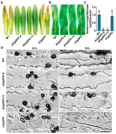 ΔCgGPI7 mutants exhibit reduced pathogenicity. (A) Pathogenicity test by spray inoculation on live maize seedings. Pictures of inoculated leaves were taken at 5 dpi. (B) Pathogenicity test on detached maize seedling leaves. Pictures of inoculated leaves were taken at 5 dpi. (C) Relative fungal biomass of detached maize seedling leaves. Bar indicates the standard deviation of six technical duplications and the small letters indicate a significant difference (p < 0.01). (D) Infection observation of wild type, ΔCgGPI7, and cCgGPI7 at 24 h and 36 h. The red and the orange arrow indicate appressorium and invasive hyphae, respectively. Bar = 25 μm.