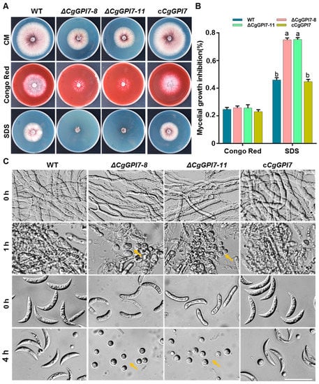 CgGPI7 is involved in cell wall integrity. (A) Colony morphology of wild types, ΔCgGPI7-8, ΔCgGPI7-11, and cCgGPI7 were identified by growing these strains on a CM medium that was amended with 0.8 mg/mL (w/v) Congo Red and 0.0025% (w/v) SDS. (B) Statistical analysis of the inhibition rate of mycelial growth. Bar indicates the standard deviation of three replicates and the small letters indicate a significant difference (p < 0.01). (C) The mycelial and conidia of indicated strains were treated with cell wall-lysing enzymes for 1 h and 4 h, respectively. Bar = 25 μm. Orange arrows indicate the released protoplasts.