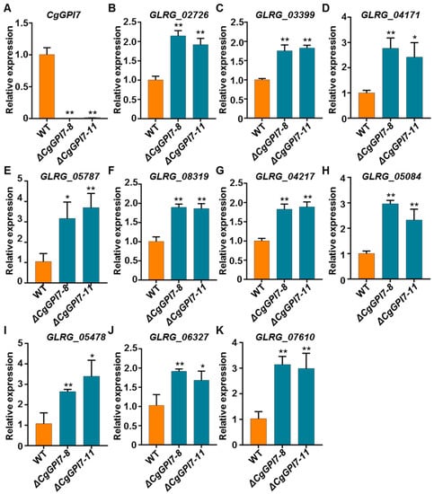 The expression of cell wall synthesis-related genes was induced in the ΔCgGPI7. (A) qRT-PCR was used to verify the expression of CgGPI7 in wild-type, ΔCgGPI7-8, and ΔCgGPI7-11 strains. (B–F) Expression of five chitin synthase genes were quantified in wild-type, ΔCgGPI7-8, and ΔCgGPI7-11 strains via qRT-PCR. (G–K) Expression of five 1,3-beta-glucanosyltransferase genes were quantified in wild-type, ΔCgGPI7-8, and ΔCgGPI7-11 strains via qRT-PCR. Significance analysis was analyzed using Student’s t-test (* p < 0.05, ** p < 0.01). The bar represents the standard deviation of the three technical duplications.