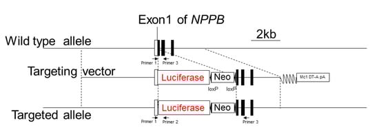 To generate the BNP in reporter mice (Accession. No. CDB1373K: http://www.clst.riken.jp/arg/mutant%20mice%20list.html, accessed on 7 December 2021), the luciferase cDNA was inserted into the initiation site of the mouse BNP gene (NPPB, GenBank #NC_000070.6, accessed 22 July 2017) A targeting vector was constructed to replace the coding region of exon 1 of NPPB with a DNA fragment containing a luciferase cDNA and loxP-flanked neomycin resistance gene driven by PGK promoter (Figure 1). A diphtheria toxin A fragment gene driven by the MC-1 promoter at the 3’ end of the targeting vector was used for negative selection. The linearized targeting vector was introduced into the HK3i C57BL/6N embryonic stem (ES) cells [39], and cells were selected in G418. Genomic DNA from ES cell clones was screened by PCR. Homologous recombination was confirmed by Southern blot analysis using external 3’ and 5’ and neomycin probes. A correctly targeted ES clone was injected into 8-cell stage embryos. Chimeric mice were mated with C57BL/6 female mice for germinal transmission. Heterozygous mice (pBNP-Luc knock-in (KI)) were backcrossed to C57BL/6J for at least seven generations. PCR genotyping was performed using the following primers: Primer 1, CCGGCAGGAATGCAGCTGATAAATC; Primer 2, GGCCATGTTGTTGTCCTCGGAGGA; Primer 3, GATGGGATGGGTGTGCAGCTTTGC. PCR product sizes are 1000 and 779 base pairs for knock-in and wild-type alleles, respectively. The pBNP-luc-KI mouse is available (R. Okamoto: ryuji@clin.medic.mie-u.ac.jp).