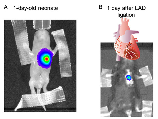 (A) Detection of luciferase activity in one-day BNP reporter mouse. (B) Detection of luciferase activity in reporter mouse one day after ligation of the left anterior descending coronary artery (LAD). BNP, brain natriuretic peptide.