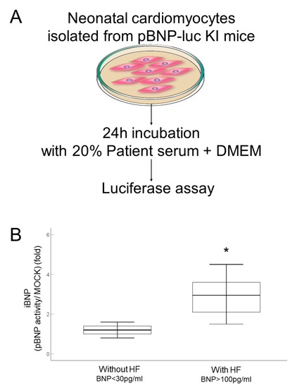 The BNP reporter system and activation of the BNP promoter in cardiomyocytes treated with serum from patients with heart failure. (A) Assay flow to measure serum-induced BNP (iBNP) expression. pBNP-luc KI mice, luciferase knock-in (KI) mice with site-specific integration of luciferase gene, which is regulated by, and acts as, an endogenous promoter of BNP (pBNP). DMEM, Dulbecco’s modified Eagle’s medium. (B) Box plot showing iBNP in cardiomyocytes from pBNP-luc KI mice stimulated with 20% serum from patients without, and with, heart failure (HF) for 24 h. n = 10. * p < 0.05 vs. without HF. BNP, brain natriuretic peptide; DMEM, Dulbecco’s Modified Eagle Medium.