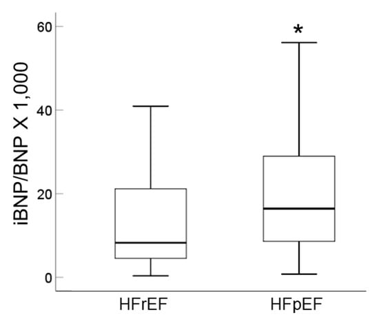 Box plot of the iBNP-to-BNP ratio in HFpEF and HFrEF. HF, heart failure; BNP, brain natriuretic peptide; iBNP, serum-induced BNP expression; pEF, preserved ejection fraction; rEF, reduced ejection fraction. * p < 0.05 vs. HFrEF.