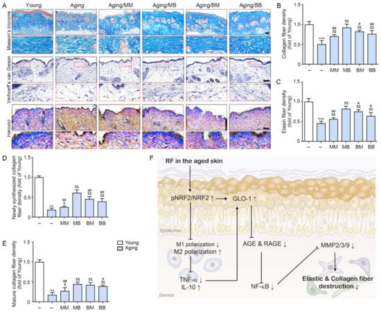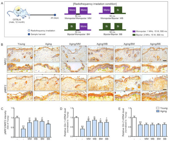 Even though RF is known to decrease TNF-α expression in UV-radiated skin, it has not been fully revealed whether RF radiation increases skin elasticity in aged skin via increasing NRF2 and decreasing AGE accumulation. We evaluated the effect of RF in increasing NRF2 and GLO by modulating M1/M2 and decreasing TNF-α in an aged animal model. We hypothesized that RF radiation led to increased NRF2, which resulted in decreased M1. Activated NRF2 and decreased M1 led to increased GLO and decreased TNF-α. Those changes led to decreased AGE accumulation and decreased RAGE and eventually led to decreased NF-κB. The latter implies decreased MMP activation, which eventually yields lower collagen destruction and increased skin elasticity in aged skin. We also compared the studied effects of RF by considering each mode (MM: monopolar mode applied twice, MB: the application of monopolar mode and then bipolar mode, BB: bipolar mode applied twice, BM: the application of bipolar mode and then monopolar mode) and different combinations of them.