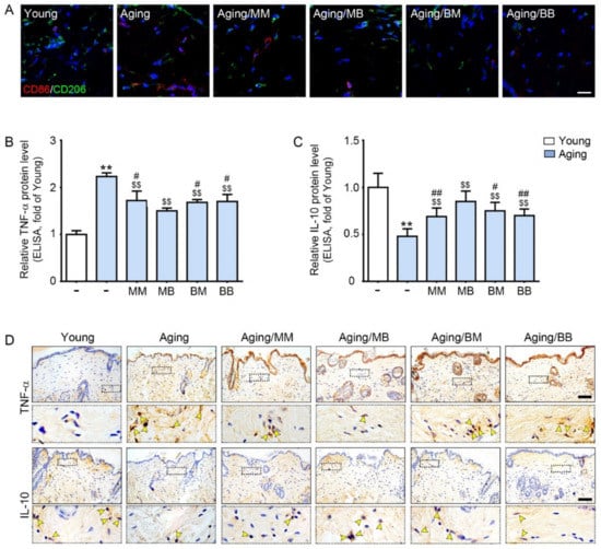 The modulating effect of M1/M2, TNF-α, and IL-10 depending on the considered combinations of RF modes: (A) Double-stained confocal microscopic images showing the expression of M1 (CD86, red) and M2 (CD206, green) markers. Nuclei were stained blue using DAPI (scale bar = 100 μm). (B,C) ELISA was used to determine the protein expression levels of (B) TNF-α and (C) IL-10 in the skin tissue. (D) TNF-α and IL-10 expression in the dermis of the aged mice skin was assessed immunohistochemically (scale bar = 100 µm). The yellow arrows point to positive signals. Data are presented as mean ± SD. **, p < 0.01, vs. Young; $$, p < 0.01, vs. Aging; #, p < 0.05 and ##, p < 0.01, vs. Aging/MB (Mann–Whitney U test). MM, monopolar mode applied twice; MB, application of monopolar mode followed by application of the bipolar mode; BB, bipolar mode applied twice; BM, application of the bipolar mode followed by application of the monopolar mode; CD86, cluster of differentiation 86; CD206, cluster of differentiation 206; DAPI, 4′,6-diamidino-2-phenylindole; TNF-α, tumor necrosis factor-alpha; IL-10, interleukin-10.