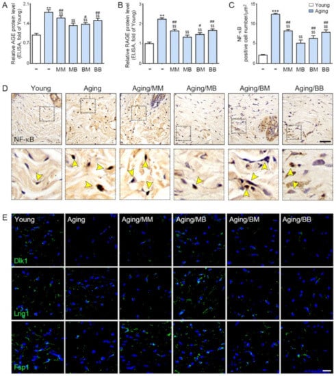 The recovery effect of NF-κB by AGE, RAGE, and papillary and reticular fibroblasts depending on the combination of RF modes: (A,B) The protein expression levels of (A) AGE and (B) RAGE were determined in the skin tissue by ELISA. (C) Quantitative graphs represent the nuclear NF-κB-positive cell number. (D) NF-κB expression in the dermis of the aged mice skin were assessed immunohistochemically (scale bar = 100 µm). The yellow arrows point to positive signals. (E) Immunofluorescence analysis showed the expression of Dlk1-, Lrig1-, and Fsp1-positive cells (green). Nuclei were stained blue using DAPI (scale bar = 100 μm). Data are presented as mean ± SD. **, p < 0.01 and ***, p < 0.001, vs. Young; $$, p < 0.01, vs. Aging; #, p < 0.05 and ##, p < 0.01, vs. Aging/MB (Mann–Whitney U test). MM, monopolar mode applied twice; MB, application of monopolar mode followed by application of the bipolar mode; BB, bipolar mode applied twice; BM, application of bipolar mode followed by monopolar mode; AGE, advanced glycated end products; RAGE, rage of advanced glycated end products; NF-κB, nuclear transcription factor-κB; Dlk1, delta-like non-canonical notch ligand 1; Lrig1, leucine-rich repeats and immunoglobulin-like domains 1; Fsp1, ferroptosis suppressor protein 1.