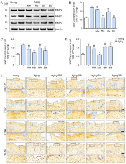 The modulating effect of MMP2/3/9, COL1A1, FBN1/2, and FBLN5 depending on the combinations of RF modes: (A) The expression levels of MMP2, 3, and 9 in the skin protein were assessed by Western blot. (B–D) Quantitative graphs and representative Western blot images. (E) COL1A1, FBN1/2, and FBLN5 expression in the dermis of the skin from the aged mice was assessed immunohistochemically (scale bar = 100 µm). Data are presented as mean ± SD. **, p < 0.01, vs. Young; $$, p < 0.01, vs. Aging; ##, p < 0.01, vs. Aging/MB (Mann–Whitney U test). MM, monopolar mode applied twice; MB, application of the monopolar mode followed by the bipolar mode; BB, bipolar mode applied twice; BM, application of bipolar followed by monopolar mode; MMP, metalloproteinases; COL1A1, collagen type I α1; FBN, fibrillin; FBLN, fibulin.