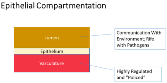 Many excellent reviews exist in the published literature dealing with the vital importance of epithelial and endothelial barriers, and the disease implications of their compromise [8,9,10,11,12]. Functional barriers are vital physiologically because they underwrite the very possibility of vectorial, unidirectional transepithelial/transendothelial transport; i.e., absorption and secretion at the tissue/organ level. However, in the case of epithelial barriers, they are also essential because they invariably sequester an immunologically “nasty” luminal (apical) compartment (often communicating with the outside environment) from the pristine systemic bloodstream (basal-lateral) compartment on the opposite side of the barrier. Those two worlds “mixing” in an unregulated manner is the genesis of a great deal of morbidity, and not simply in infectious disease. (Figure 1.)