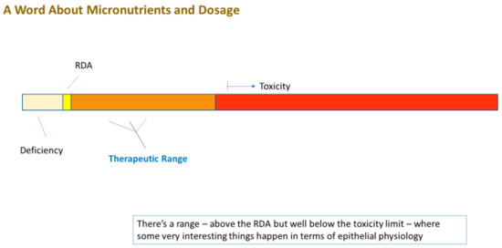 Even more remarkable is that these compounds are generally safe. In fact, the FDA applies the GRAS (“Generally Recognized as Safe”) status on many of them. Moreover, many are safe at levels above their RDA (Recommended Daily Allowance) level. Using zinc as an example, this micronutrient—the second most abundant transition metal in the body—has a typical dietary intake of 5–10 mg/day [1]. The blood level of zinc is typically 10 micromolar (µM) [2]. Raising this level to 50 µM activates or amplifies cellular signaling pathways that, among many other diverse actions, modify the tight junctional (TJ) complexes around epithelial cells in diverse epithelial tissues (these seals being the lynchpin to our tissue and organ level compartmentation). Based upon simple Michaelis–Menten kinetics, zinc at a 5 µM concentration may have only negligible affinity for a binding site on a random signaling intermediate protein, but zinc at 50 µM may exhibit significant binding (and protein activation). In humans, this increased plasma zinc concentration is safely achievable by increasing zinc intake to 50–60 mg/day, roughly 5–10 times our normal dietary intake. What is thoroughly remarkable is that this elevated zinc level not only modifies the TJ complexes, but also improves them. They are less leaky basally and they are less prone to leakiness in disease states such as inflammatory cascades [3,4,5]. We say “remarkable” because the TJ complex is indeed a complex array of over 26 different barrier proteins and 20 or more junctional-associated intracellular proteins [6,7]. To improve such a byzantine structure by modifying its individual components is a huge biologically impressive feat.