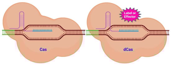 However, the CRISPR-Cas system is not confined to only causing double-strand breaks (DSB). It is possible to modify the Cas protein to preserve its targeting capability while it loses its ability to cut DNA []. Cas/dead Cas (dCas) (the latter is catalytically inactive) can be used as it is or be modified with various functional groups. Molecules (labels and effectors) can be attached to dCas as shown in Figure 1. These molecules can then be placed closer together or be associated to specific areas of the genome.
