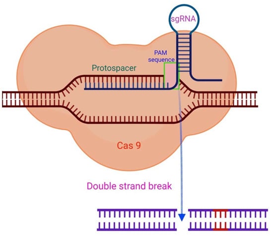 The CRISPR/Cas9 mechanism. By complementary base pairing, the sgRNA recognizes the target sequence (protospacer) in a host organism’s genome. The Cas9 nuclease causes a DSB in a PAM sequence region with a NGG (any nucleobase followed by two guanine nucleobase) sequence at the 3′position. Adapted from [] and generated with BioRender software.