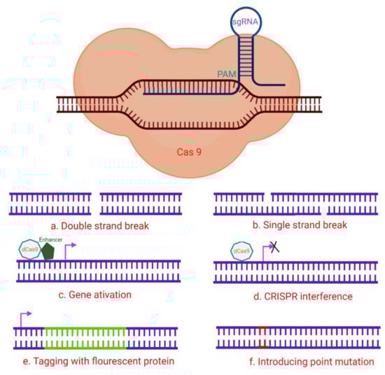 A hypothetical CRISPR/Cas9 experimental design. The numerous Cas9 variants available have made it easier to perform a variety of genomic modifications, including (a) induction of DNA DSB utilizing wild-type Cas9; (b) Cas9 nickase is used to induce DNA SSBs, in which two neighboring gRNAs target distinct strands, resulting in a DSB and subsequent NHEJ (non-homologous end joining) response; (c) The target gene is activated via CRISPR activation utilizing dCas9 and transcription activator fusion with transcription-activating proteins such as VP64 that target the promoter region. (d) By steric hindrance, CRISPR interference with dCas9 or dCas9-BFP decreases gene expression, and the dCas9-KRAB fusion epigenetically marks the gene for transcriptional repression. These methods can be used to stop gene transcription transiently. (e) A donor template that includes a fluorescent protein gene with homology regions can be used to drive homology-directed repair (HDR). By cutting at the target location with Cas9-WT or Cas9 nickase, it is possible to tag genes with fluorescent proteins. In another setting, the donor plasmid might include a selectable marker for determining whether knock-in events do occur. (f) Cas9-WT or Cas9 nickase also initiate the introduction of point mutations via HDR from an ss oligonucleotide. Adapted from [] and generated using BioRender software.