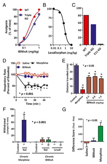 IBNtxA pharmacology (adapted from []). (A) IBNtxA analgesia. ED50 values (and 95% confidence limits) obtained from dose–response curves were 0.22 mg/kg (0.13, 0.32) in WT mice and 0.39 mg/kg (0.15, 0.58) in triple-KO mice by using the radiant heat tail-flick assay. (B) Reversal of IBNtxA analgesia by levallorphan. IBNtxA (0.75 mg/kg, s.c.). (C) IBNtxA analgesia in KO mice (IBNtxA, 0.5 mg/kg, s.c.). (D) Respiratory rate. It was assessed in awake, freely moving CD1 mice that had been administered morphine (20 mg/kg, s.c.), IBNtxA (2.5 mg/kg, s.c.), or saline using the MouseOx pulse oximeter system (Starr Life Sciences). (E) Gastrointestinal transit. Morphine (5 mg/kg, s.c.). (F) Physical dependence. After being treated with morphine (10 mg/kg, s.c.) or IBNtxA (1 mg/kg, s.c.) for 10 days, mice were challenged with indicated naloxone. The number of jumps during 15 min was counted. (G) Conditioned place preference in a two-compartment apparatus with IBNtxA (1 mg/kg) or morphine (10 mg/kg).