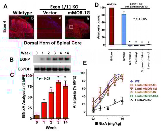 Gain-of-function study using lentivirus expressing the 6TM variants in a double-exon 1/11 KO mouse model. (A) Distribution of lentiviral-expressed mMOR-1G in the dorsal horn of the spinal cord with an exon 4 antibody. (B) Time course of the spinal EGFP mRNA expression determined by RT-PCR after the lentivirus injection. EGFP was co-expressed in lentivirus as a marker. (C) IBNtxA analgesia. (D) Opioid analgesia with a single dose of IBNtxA (2.5 mg/kg), morphine (10 mg/kg), fentanyl (0.08 mg/kg), buprenorphine (1 mg/kg), or levorphanol (0.8 mg/kg). (E) IBNtxA cumulative dose–response curves. (A–D) are adapted from [] and (E) is adapted from [].