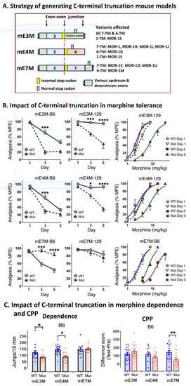 Different inbred mouse strains, particularly C57BL/6J (B6) and 129, have divergent responses to mu opioids [,,]. For example, chronic morphine treatment produces robust tolerance and physical dependence by naloxone-precipitated withdrawal in B6 mice. However, 129 mice do not develop morphine tolerance or physical dependence despite morphine analgesia being equally potent in both strains. Thus, three C-terminal truncation mouse models were generated in both B6 and 129 backgrounds to investigate the role of C-terminal truncation in the different genetic backgrounds []. Truncating all the C-termini in mE3M-B6 mice or exon 4-encoded C-termini in mE4M-B6 mice with a B6 background led to the development of morphine tolerance faster than in WT B6 mice (Figure 4). Interestingly, the same truncation in mice with the 129 background made morphine tolerance-resistant 129 mice become morphine tolerance-vulnerable in both mE3M-129 and mE4M-129 models [].