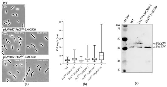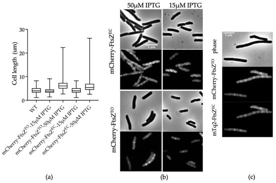 Overexpression of FtsZTO and FtsZEC. (a) Phase contrast images of E. coli wild-type strain LMC500 that expressed FtsZTO or FtsZEC from plasmids pJW11 or pJW12, respectively, induced with 15, 50, or 100 μM IPTG grown in TY medium at 28 °C for 4 h. (b) Quantification of the length (μm) of cells treated as shown in (a) and of cells where FtsZTO was induced by incubation in 100 µM IPTG. The numbers of cells analyzed were, from left to right, 910, 1193, 1056, 1227, 995, and 974. (c) Western blot of FtsZTO and FtsZEC that were expressed in LMC500 from plasmids pJW11 or pJW12 with 15 μM IPTG induction.