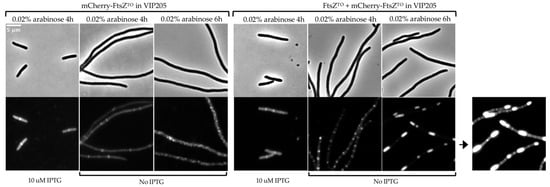 To investigate whether FtsZTO would be able to polymerize into a ring without FtsZEC, plasmids pJW15 and pJW16 were constructed that expressed both FtsZTO and mCherry-FtsZTO in the same operon or only mCherry-FtsZTO under the control of the arabinose-inducible promoter, respectively. As the fluorescent fusions to FtsZ are, in general, not fully functional, mCherry-FtsZTO is only able to polymerize into a ring in the presence of untagged FtsZTO (Figure 3). The plasmids were transformed into strain VIP205, in which the native FtsZEC can be depleted as the ftsZ gene is dissociated from its native promoter and expressed from the chromosome by an IPTG-inducible promoter []. VIP205 carrying pJW15 or pJW16 exhibited a normal rod-shape morphology and midcell localization of mCherry-FtsZTO (Figure 3) when grown in TY medium in the presence of 0.02% arabinose and 10 μM IPTG at 28 °C for 4 h; the cells were similar to wild-type cells expressing mCherry-FtsZTO from pJW13, as shown in Figure 2. When pJW15 was induced with arabinose in the absence of IPTG for 4 h, cells became extremely filamentous and FtsZTO assembled into multiple rings, indicating that it is likely able to polymerize on its own (Figure 3). A longer time of induction led to regularly and evenly distributed barrel-shaped fluorescence signals (Figure 3). We used the FtsZEC antibody on Western blots to detect the amount of FtsZEC and FtsZTO (Figure S1). However, after IPTG was removed for 6 h, there was still a very small amount of FtsZEC left in the cells, and FtsZTO and mCherry-FtsZTO were almost equally expressed after induction. As an essential gene, ftsZEC cannot be deleted in E. coli. When only mCherry-FtsZTO from pJW016 was induced with 0.02% arabinose in VIP205 for 6 h, no FtsZTO rings or barrels were observed any more (Figure 3). Obviously, not enough FtsZEC was present to assist in the formations of the FtsZTO rings observed when mCherry-FtsZTO and FtsZTO were both present. In conclusion, the comparison of FtsZTO and mCherry-FtsZTO, and mCherry-FtsZTO only, revealed that in E. coli, FtsZTO can independently self-assemble into ring structures on the cytoplasmic membrane, although the FtsZTO ring is not fully functional and not under proper cell cycle control.