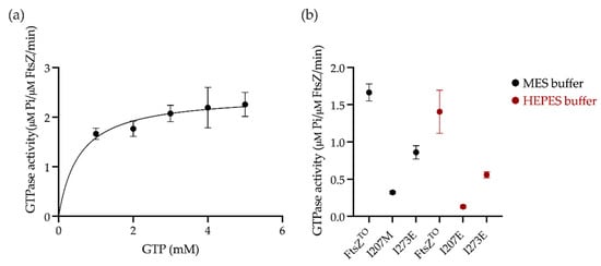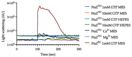 A light scattering assay was performed in a quartz cuvette (Hellma Analytics, Müllheim, Germany, 10 mm light path, 4 mm light width) and measured with a spectrofluorimeter (Photon Technology International, Birmingham, NJ, USA) at 28 °C, which is the same temperature used for cell growth. The excitation and emission wavelengths were set to 350 nm. FtsZTO (25 μM) in HEPES buffer (50 μM HEPES (Sigma-Aldrich, St. Louis, MO, USA), 50 mM KCl, 5 mM MgCl2) or MES buffer (50 μM MES (Sigma-Aldrich, St. Louis, MO, USA), 50 mM KCl, 5 mM MgCl2) was maintained at 28 °C for 100 s to obtain a baseline, and GTP (Sigma-Aldrich, St. Louis, MO, USA) at the indicated concentration was added into the sample to induce polymerization [].
