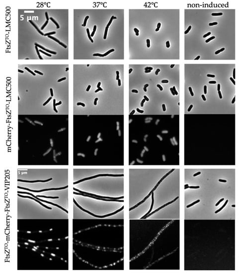 L. oneistus is not resistant to heat stress and its survival rate drops significantly from 90% to 50% (after three hours of incubation at 41 °C or 42 °C, respectively) []. Hence, we investigated the effects of temperature on FtsZTO. The overexpression of FtsZTO with 50 μM IPTG induction for six mass doubling times caused filamentation of wild-type E. coli cells at 28 °C (around ambient temperature of L. oneistus and Ca. T. oneisti) and at 37 °C. Interestingly, cells at 42 °C became rounded and could not maintain their rod shape after induction (Figure 7). The midcell localization of mCherry-FtsZTO in wild-type E. coli was only present when induced at 28 °C. At 37 °C and 42 °C, mCherry-FtsZTO lost its localization and some cells formed inclusion bodies at 42 °C. For VIP205 cells carrying pJW15-expressing FtsZTO and mCherry-FtsZTO induced for 6 h with 0.02% arabinose, clear rings and barrel structures were formed at 28 °C and regular patches were observed at 37 °C. No clear structures were observed in cells at 42 °C, but some inclusion bodies were produced. These results suggest that the morphological effects of FtsZTO on E. coli and its localization are temperature-sensitive and that FtsZTO is adapted to function at 28 °C.