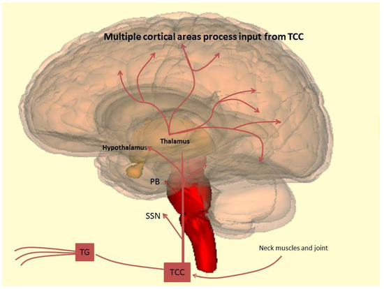 Furthermore, it has been shown that tactile and thermal stimuli enhance pulvinar thalamic activity in patients with migraine suffering from extracephalic allodynia. According to these data, there is a connection between the thalamus and the presence of extracephalic allodynia during migraine attacks [71,72]. The trigeminovascular system is subject to a powerful modulation in the genesis of head pain. This modulation takes place at different levels, mostly coming from corticofugal projections to multiple brainstem regions, including the periaqueductal grey, pontine, raphe, and medullary reticular nuclei [73,74]. Although direct corticotrigeminocervical complex projections originate largely in the primary somatosensory cortex, it has been shown that visual and insular cortices have a key role in the modulation of trigeminocervical complex neuronal activity.