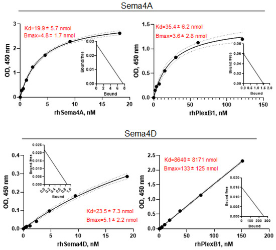 To analyze Sema4A- and Sema4D–Plexin B1 interaction, we employed the direct LRA and competition LRA as described previously [53,54]. Briefly, Immulon 2HB microtiter plates were coated with either rhSema4A-GST or -Fc or rhSema4D-Fc in duplicates in varying doses, starting from 2 μg/mL to 0.015 μg/mL overnight at 4 °C in 0.1M sodium carbonate-bicarbonate buffer. For receptors, the starting concentration of rhPlexin B1-His or rhNRP2-Fc was 8–10 μg/mL. In some experiments, HIS-Select nickel-coated microplates (Sigma) were used to capture Plexin B1-His (10 μg/mL). The same range of concentrations was used for proteins in solutions. ELISA was performed as described [53,54] and the amount of bound ligand was measured spectrophotometrically on the SPECTROStar Nano microplate reader (BMG Labtech) at 450 nm. Data were analyzed using a nonlinear regression analysis with GraphPrizm 8 software using the following equation: