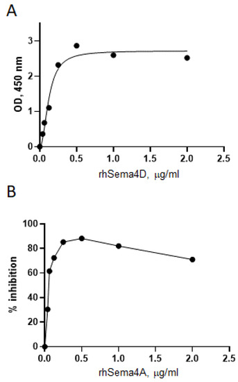 We next investigated the competition between Sema4A and Sema4D for the Plexin B1 receptor. For that purpose, His-tagged Plexin B1 was coupled to HIS-Select nickel-coupled microplate and increasing concentrations of rhSema4D were applied to wells, whereas in separate wells the increasing concentrations of rhSema4A were added to the microplate wells containing 2 μg/mL of Sema4D (Figure 3). rhSema4D binds plate-immobilized Plexin B1 with high affinity (Figure 3A), whereas the addition of rhSema4A inhibits such binding by >70% (Figure 3B). These results demonstrate that Sema4D and Sema4A compete in vitro for Plexin B1. Therefore, they could be competing for Plexin B1 ligands in vivo, as one ligand–receptor interaction could mask another ligand’s binding domain.