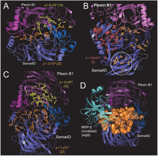 BPPS-SIPRIS analyses of the Sema4D–PlexinB1 complex (pdb_id: 3ol2). (A) BPPS-SIPRIS analysis identifying Sema4D- and PlexinB1-specific residues significantly clustered at the Sema4D–PlexinB1 interface; p-values and, in parentheses, the corresponding node IDs are indicated. Shown in orange are Sema4D residues contacting Plexin B1 and in yellow Plexin B1 residues contacting Sema4D. (B) Sema4D family- and subfamily-specific residue clusters identified by BPPS-SIPRIS (residue sidechains shown in red and orange, respectively). Two subfamily clusters were found: adjacent to the Plexin B1 interface and another at the Sema4D homodimeric interface (circled). (C) BPPS-SIPRIS analysis identifying Sema4D- and PlexinB1-specific residues significantly clustered within each subunit. (D) The Sema4D-specific residues in panel C (orange space-fill) are relative to a modeled interaction with MSP-β subunit. Bound MSP-β was modeled by structurally superimposing, over Plexin B1, the Ron Sema domain + MSP-β complex (pdb_id: 4qt8). Although merely hypothetical, this suggests that the larger Sema4D surface in panel C may facilitate binding of other cellular components.