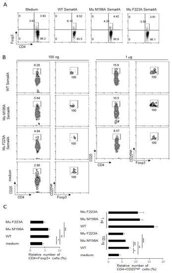 The mutant proteins were tested for their stimulatory effect on Treg cells in PBMC cultures, as described previously [17]. As expected, WT Sema4A displayed a highly specific effect on Treg cells, as it increased the relative number of CD4+Foxp3+ cells among PBMCs from 3.96 ± 0.46% in cultures with medium only to 6.18 ± 0.58% in cultures with 100 ng of WT Sema4A (Figure 8A,C). At the same time, the M198A Sema4A mutant demonstrated a more modest effect on the relative number of Tregs to 6.07 ± 0.61% of CD4+Foxp3+ cells in cultures (p < 0.008 vs. medium control). In contrast, the F223A mutant had little to no Treg-stabilizing activity when compared to the media control (4.35 ± 0.52% vs. 3.96 ± 0.46%, respectively) and was substantially less effective than WT Sema4A (4.35 ± 0.52% vs. 6.18 ± 0.58%, respectively, p < 0.038) (Figure 8A,C). Next, we compared the stimulatory effects of an increased dose of 1 μg/mL for all selected proteins on high CD25 expression on T cells (Figure 8B,C). In the PBMC cultures with medium, only 3.83 ± 0.5% of CD4+ T cells expressed high levels of CD25, while in the presence of WT Sema4A this increased in a dose-dependent manner (Figure 8C). These CD25high T cells co-expressed Foxp3 (Figure 8B). Notably, the CD25high expression on Treg cells for WT Sema4A was twice that of the F223A mutant. Therefore, a mutation of phenylalanine at 223 position of Sema4A led to a significant disfunction of this protein in terms of its stimulatory effect on human Treg cells.