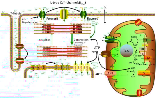 In addition to ATP production by the activation of TCA cyclase and ATP synthase, mitochondrial Ca2+ has been reported to directly activate L-type Ca2+ channels in adult guinea pigs and mouse vascular myocytes, increasing NADH production, oxygen consumption, and ROS production [57,58,59]. Therefore, a change in L-type Ca2+ activity may play an important role in Ca2+-dependent mitochondrial energetics, but the precise mechanism underlying his phenomenon remains to be elucidated. It has also been reported that the activation of L-type Ca2+ channels not only regulates Ca2+ influx but also Ψm independently of mitochondrial Ca2+ uptake [59]. Mitochondrial Ca2+ plays a dual role in the process of energy supply and demand matching of cardiomyocytes. L-shaped Ca2+ channels can lead to a Ca2+ influx, triggering the release of large amounts of Ca2+ from the SR during cardiac systolic and diastolic coupling. Furthermore, Ca2+ binds to troponin C and thereby induces cardiac contraction. During the diastolic phase, Ca2+ is transported from SERCA to SR, or through the NCX to the extracellular membrane [60]. β-adrenergic stimulation increases the rate and amplitude of cytosolic Ca2+ transient. ATP is hydrolyzed to ADP, which then enters mitochondria through the ANT to activate the F1F0-ATPase and regenerate ATP. This accelerates electron flow in the ETC, and NADH is oxidized to NAD+. This is called the “pull” condition. At the same time, MCU uptakes Ca2+ into the mitochondria, activates key enzymes of the TCA cycle, and converts NAD+ into NADH. This is called the “push” condition (Figure 1). Therefore, mitochondrial Ca2+ can not only pull electrons along the ETC to increase energy consumption but also push electrons from the TCA cycle into the ETC to regenerate energy; this is known as “parallel activation” [47,61,62].