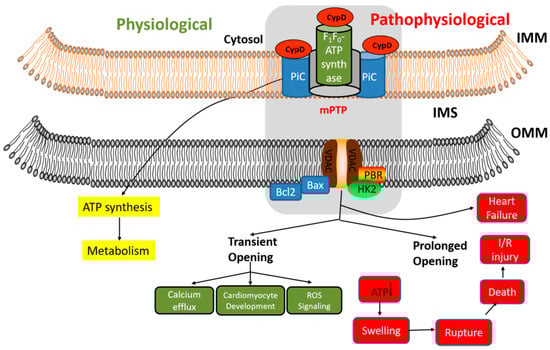 Dual role of mPTP in cardiac physiology and pathology. At the mitochondrial level, mPTP plays a dual role and participates in important physiological processes (ATP production and mitochondrial metabolism) and pathophysiological processes (cardiomyocyte death, heart failure, and I/R injury), while mCa2+ overload leads to the opening of mPTP channels. mPTP is a large nonspecific pore of cardiomyocytes. It is a protein complex composed of many proteins, including F1F0-ATP synthase, cyclophilin D(CypD), the phosphate carrier (PiC) and voltage-dependent anion channel (VDAC) among others, that opens through the inner and outer membranes of mitochondria. VDAC is located in the outer membrane of mitochondria. The prolonged opening of mPTP leads to a reduction in ATP production, depolarization of the mitochondrial inner membrane, matrix swelling, rupture of the mitochondrial outer membrane, and cell death. Finally, it causes myocardial ischemia-reperfusion injury and heart failure. The transient opening of the mPTP channel causes calcium efflux, cardiomyocyte development, and ROS signal. IMS, intermembrane space; OMM, outer mitochondrial membrane; IMM, mitochondrial inner membrane. HK2, hexokinase 2; PBR, peripheral benzodiazepine receptor; I/R injury, ischemia-reperfusion injury.