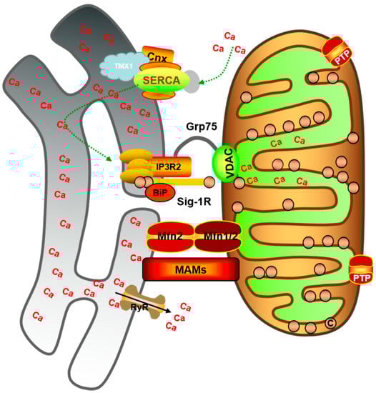 ER is the main storage site of Ca2+ in cells [189]. ER and mitochondria play an important role in the transmission of Ca2+ signals in physiological and pathological processes [190]. In the 1950s, early signs of a link between the ER and mitochondria were described [191]. In recent years, a physical coupling between mitochondria and ER, called MAM, has been discovered [192]. The number, length, and thickness of the ER in contact with mitochondria are important parameters in determining MAM function [193]. MAM dysfunction is associated with disturbances in calcium homeostasis, phospholipid metabolism, mitochondrial functions, and dynamics [193]. The importance of MAM in Ca2+ homeostasis has been established [194]. MAM is a specific microdomain of Ca2+ transfer. Cardiomyocyte mitochondria are closely related to the SR. MAM is a dynamic structure that promoted efficiency in the Ca2+ transfer from ER to mitochondria. Several proteins are involved in Ca2+ transmission [195]. MAM is a complex formed by the precise regulation of Ca2+ exchange between ER and mitochondria through the recruitment of different mitochondria-related proteins and plays an important role in maintaining mitochondrial Ca2+ homeostasis and ultimately regulating the function and survival of cells [196] (Figure 3). The proteins involved in Ca2+ transport in MAM include the ER Ca2+ releasing protein, mitochondrial outer membrane-associated protein, and mitochondrial inner membrane-associated protein [197]. Furthermore, Ca2+ efflux from the ER reaches the mitochondrial matrix through VDAC channels on the OMM and accumulates in the mitochondrial matrix through MCU complexes. The MAM chaperone glucose-regulated protein 75 (GRP75) links the Ca2+ efflux of ER with VDAC1 on the OMM to regulate mitochondrial Ca2+ uptake [198]. Therefore, GRP75 is the bridge connecting IP3R and VDAC1 [199]. Studies have revealed that when the expression of GRP75 in cells is reduced, the functional coupling between ER and mitochondria is eliminated, and the uptake of Ca2+ is affected. This indicates that GRP75 plays an important role in Ca2+ communication between ER and mitochondria [200]. An important element is IP3R, which is an inositol triphosphate-dependent Ca2+ channel located on the ER membrane that controls the outflow of Ca2+ from ER into the cytoplasm. It forms the IP3R-GRP75-VDAC1 complex with IP3R and VDAC1 [201]. VDAC is a mitochondrial outer membrane protein, which together with MCU, regulates Ca2+ influx into mitochondria. The protein complex is responsible for Ca2+ transfer from ER to mitochondria [200,201]. It has been reported that Ca2+ transport to mitochondria requires an MCU known as the IP3R-GRP75-VDAC-MCU Ca2+ regulatory axis [194,201]. Because mitochondrial Ca2+ is a key regulator involved in many biological functions, the IP3R-GRP75-VDAC-MCU complex may play an important regulatory role in various cellular functions. It has recently been shown that proteins such as transglutaminase type 2 (TG2) [199], CypD, and DJ-1 [202] interact with the IP3R-GRP75-VDAC1 complex to regulate Ca2+ transfer from ER to mitochondria. Studies have revealed that CypD, as a member of the ER and mitochondrial contact site VDAC1-GRP75-IP3R1 complex, promotes Ca2+ transfer in the two organelles, inhibits CypD, IP3R, and GRP75, reduces protein interactions in the complex, and slows down mitochondrial Ca2+ overload. It is suggested that mitochondrial Ca2+ uptake plays an important role in cardiac ischemia-reperfusion injury and can be used as a target for cardiac protection [203]. Phosphofurin acidic cluster sorting 2 protein (PACS-2) is a multifunctional cytoplasmic protein that induces apoptosis [204,205]. However, whether PACS-2 can directly attach to MAM is not clear. The loss of PACS-2 has been reported to reduced ER-mitochondrial contact and mitochondrial fragmentation [204]. Sigma non-opioid intracellular receptor 1 (SigR1) and tespa1 are also important proteins that bind the IP3R-GRP75-VDAC-MCU calcium channel on MAM. Furthermore, SigR1 overexpression increases Ca2+ efflux from ER by interacting with ankyrin and the ER chaperone protein BiP [206,207]. Tespa1 regulates Ca2+ levels by binding to IP3R and GRP75. The knockdown of Tespa1 reduces mitochondrial and cytoplasmic Ca2+ levels [208]. The Fun14 domain containing 1 (FUNDC1) is another protein that regulates the dynamics of MAM [209]. While IP3R2 binds FUNDC1 to regulate SR Ca2+ release [210], FUNDC1 competitively binds DRP1 during early hypoxia. In the late stage of hypoxia, FUNDC1 separates from calnexin and binds DRP1, leading to mitochondrial fission and mitophagy [211]. Presenilin (PS) is a multifunctional protein whose mutation leads to familial Alzheimer’s disease [212]. PS interacts with MFN2 to regulate MAM under Ca2+ overload. The PS2 gene mutation affects mitochondrial Ca2+ delivery [213,214]. In conclusion, MAM plays an important role in mitochondrial Ca2+ overload and cell necrosis.