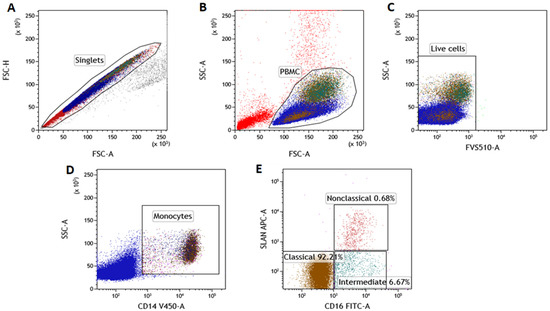 An example of the cytometric evaluation of SLAN-positive and SLAN-negative monocytes’ subpopulations from a CLL patient. (A) FSC-H vs. FSC-A dot plot of the doublets’ elimination (setting up gate covering the singlets population); (B) dot plots of SSC-A vs. FSC-A gating of PBMC cells; (C) dot-plot of the FVS510 vs. SSC exclusion of dead cells from further analysis. Live cells collected in the LIVE CELLS gate were used for further evaluation. (D) From the living cells, CD14+ cells (dot plot: SSC vs. CD14 V450; gating of Monocytes) were identified. The presence of the CD14 marker and scatter properties were the basis for the identification of monocytes. (E) SLAN APC vs. CD16 FITC dot plot—the differentiated expression of CD16 and SLAN molecules allowed the identification of classical (CD14+CD16−SLAN−), intermediate (CD14+CD16+SLAN−) and non-classical (CD14dim CD16+SLAN+) monocytes.